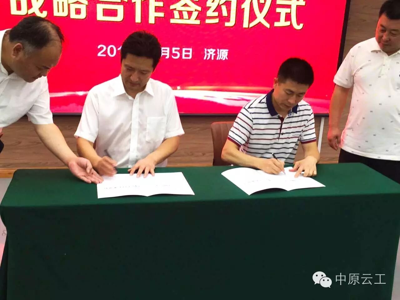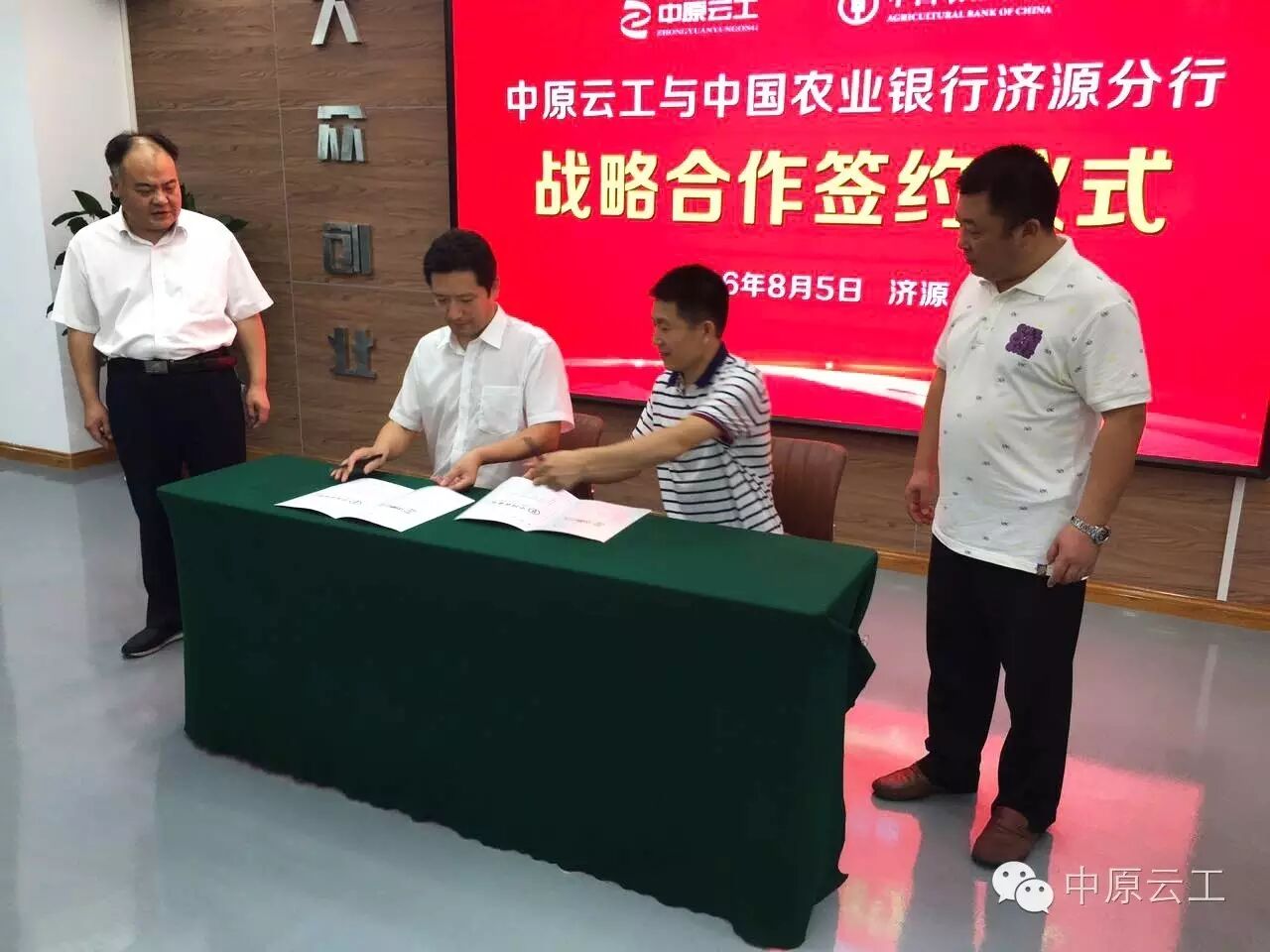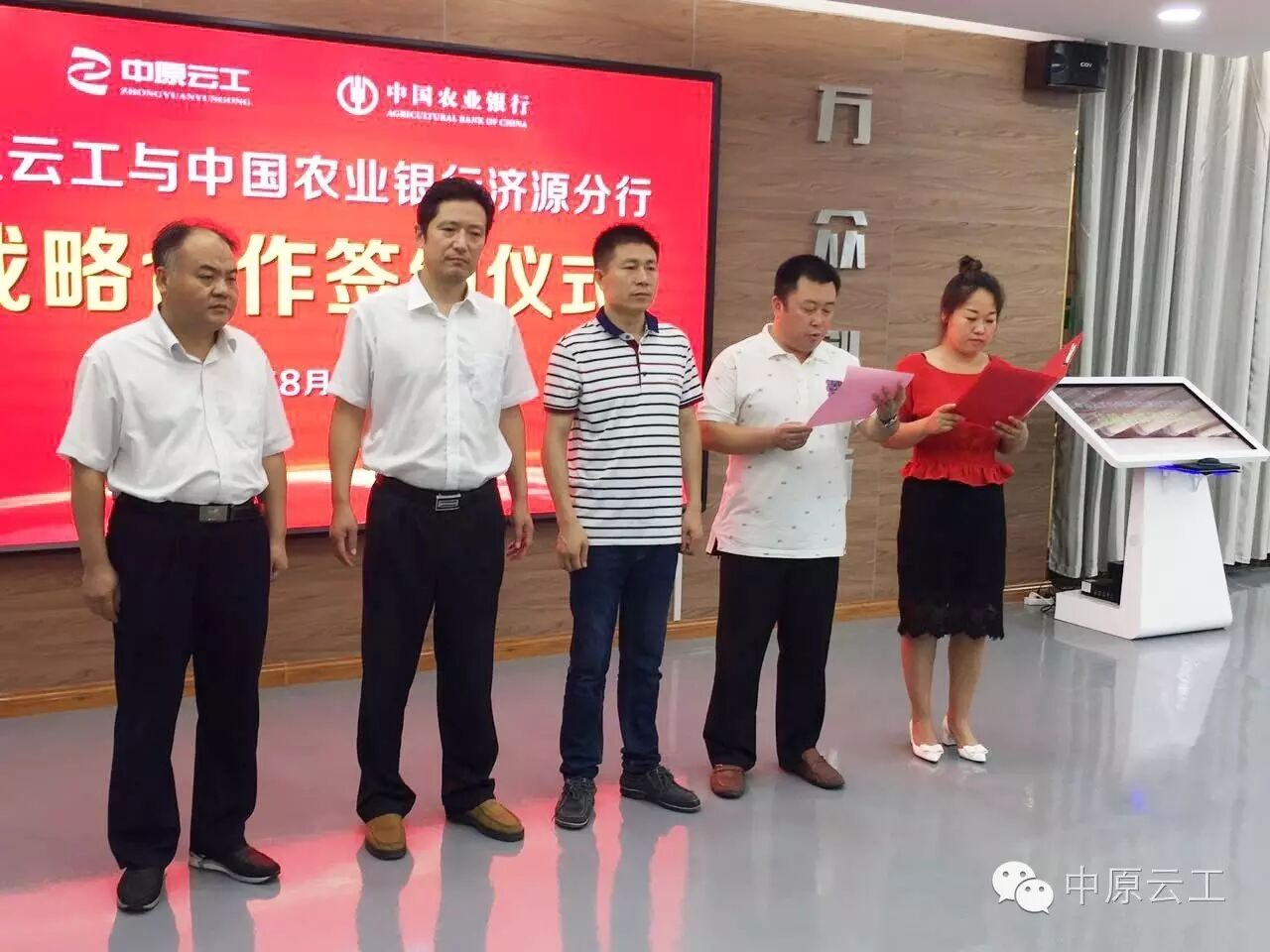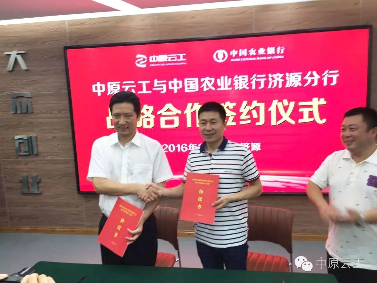 2016年8月5日,河南中原云工有限责任公司与中国农业银行济源分行在新愚公众创空间二楼举行战略合作签约仪式。 中原云工总经理齐涛、集中采购招标部总经理牛朝阳、中国农业银行济源分行副行长吴正平、个金部经理赵庆军出席了本次签约仪式。