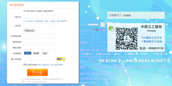 2. 进入到注册页面,请填写您的用户名、手机、注册类型等信息完成注册;